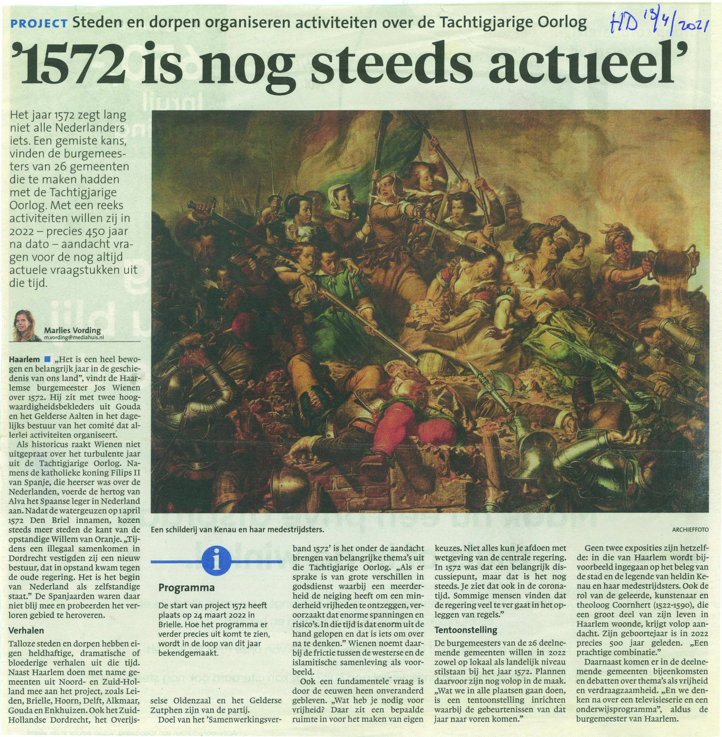 “Het is een heel bewo-gen en belangrijk jaar in de geschiedenis van ons land”, vindt de Haarlemse burgemeester Jos Wienen over 1572. Hij zit met twee hoogwaardigheidsbekleders uit Gouda en het Gelderse Aalten in het dagelijks bestuur van het comité dat allerlei activiteiten organiseert.