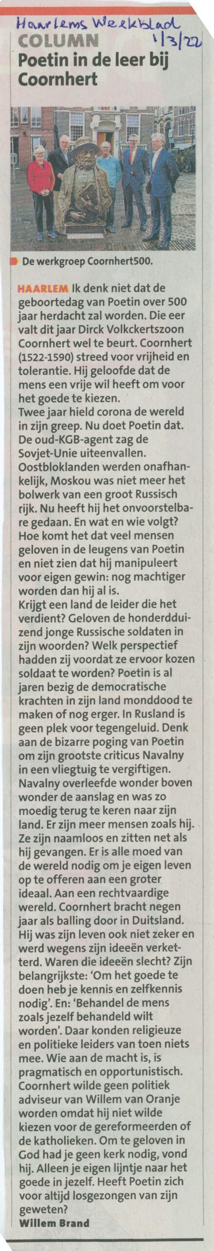 Ik denk niet dat de geboortedag van Poetin over 500 jaar herdacht zal worden. Die eer valt dit jaar Dirck Volkckertszoon Coornhert wel te beurt. Coornhert (1522-1590) streed voor vrijheid en tolerantie. Hij geloofde dat de mens een vrije wil heeft om voor het goede te kiezen.