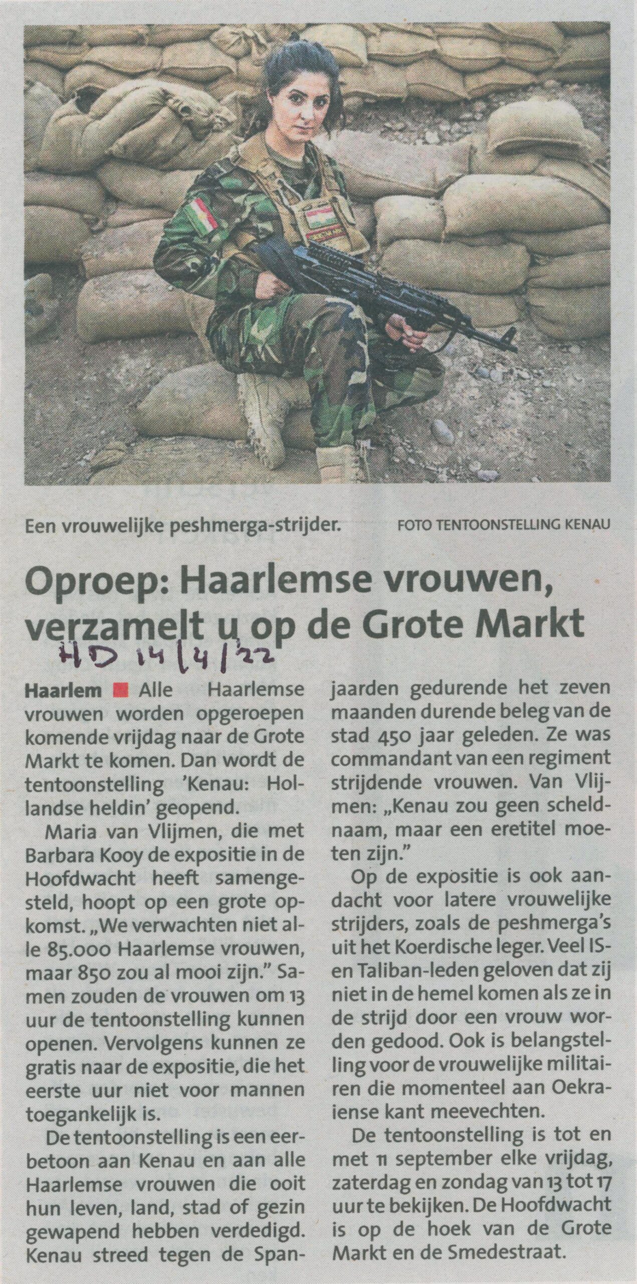 De Coornhert Stichting Haarlem en de Historische Vereniging Haarlem roepen alle Haarlemse vrouwen op vrijdag 15 april om 13.00 uur naar de Grote Markt te komen, om gezamenlijk de tentoonstelling ‘Kenau: Hollandse heldin’ te openen. Plaats: Hoofdwacht (Grote Markt, hoek Smedestraat)