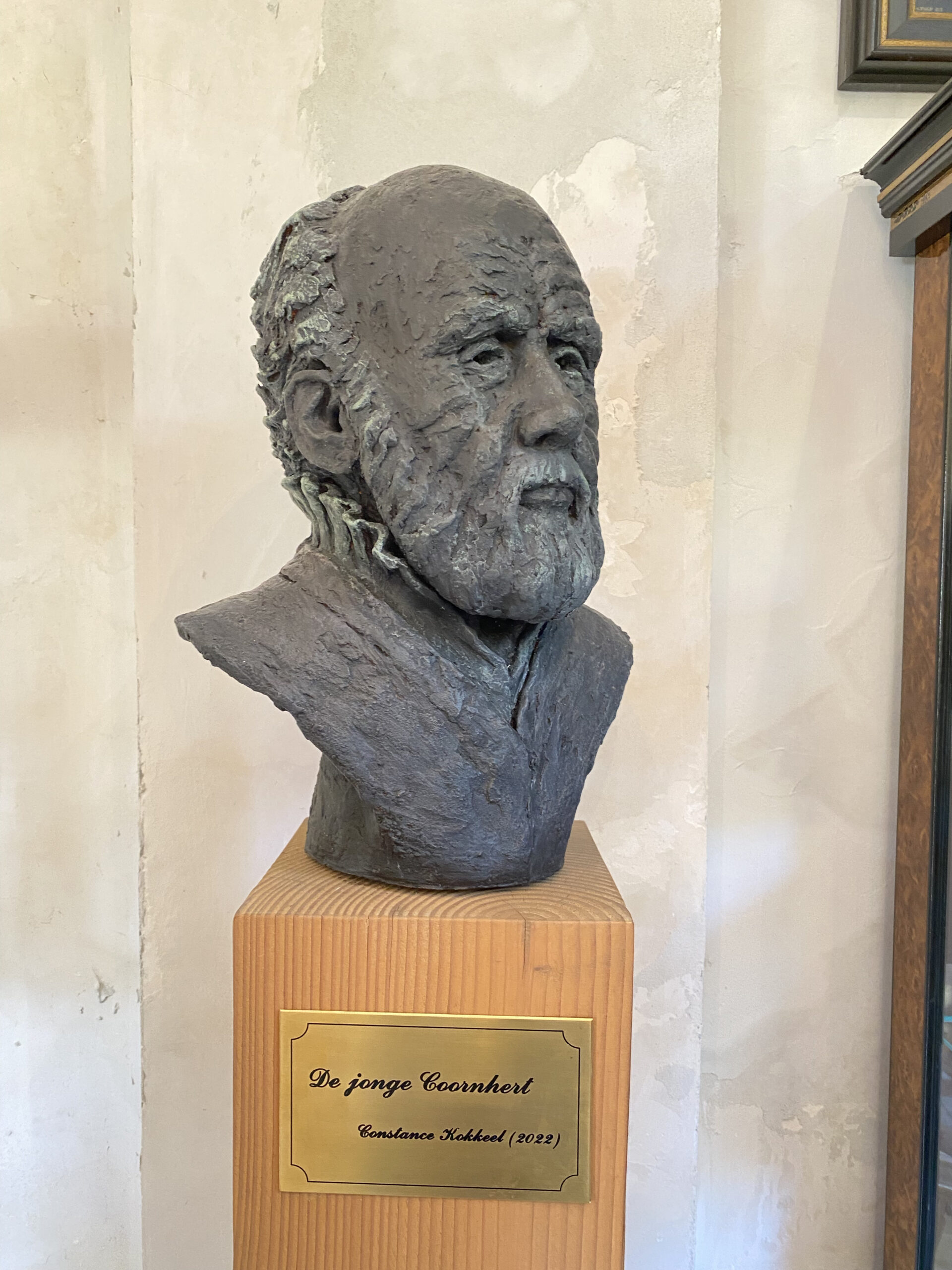 • de plaquette die als herinnering aan Coornhert in 1990 is aangebracht aan het stadhuis;