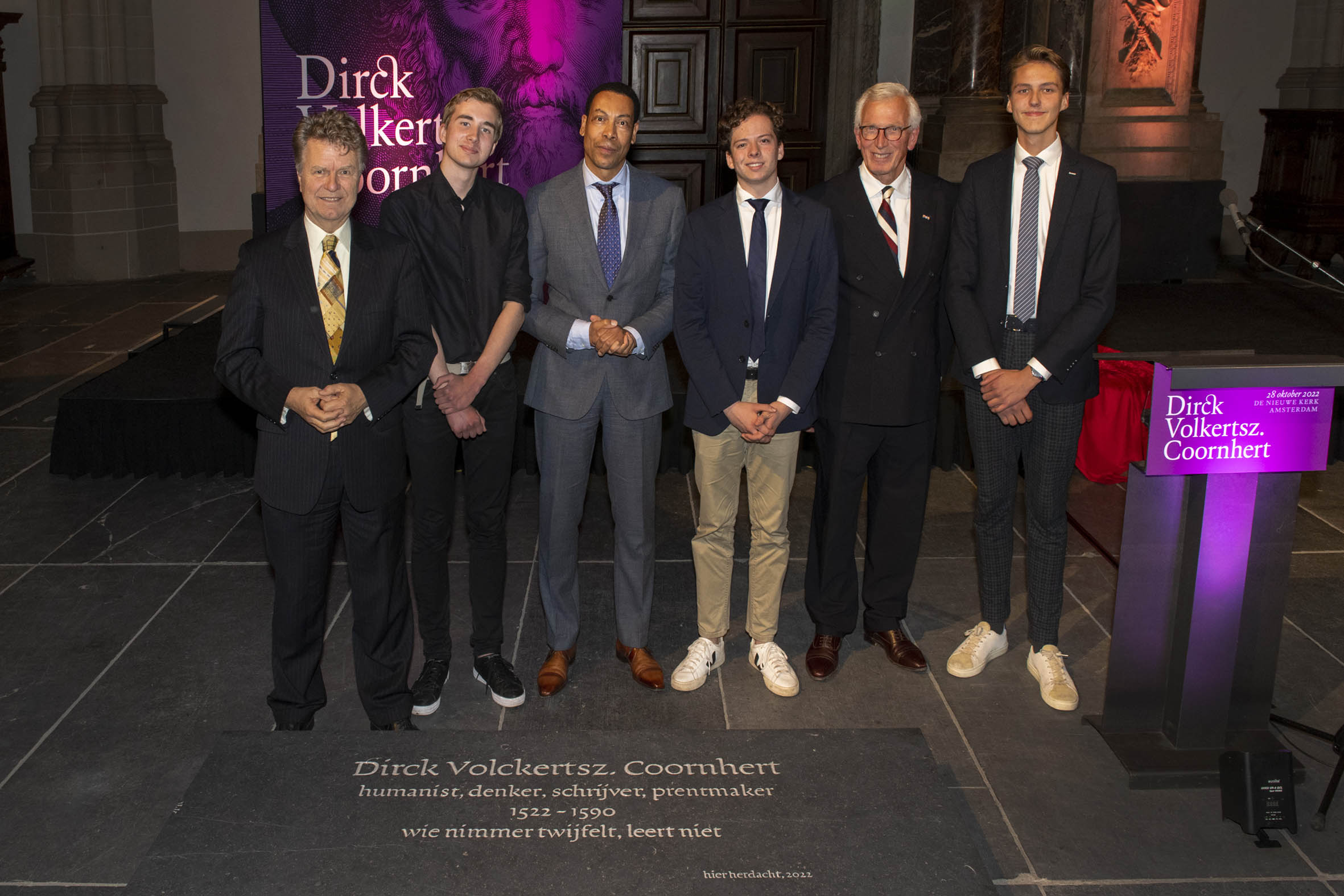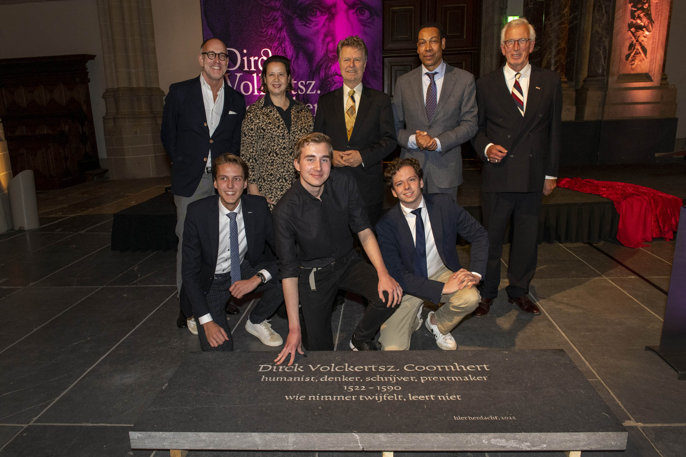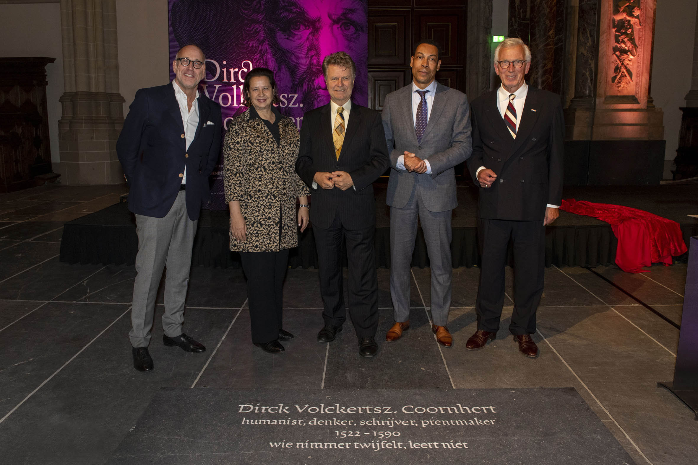 Met enkele leerlingen van het Coornhert Lyceum onthulden de sprekers vervolgens de Coornhert-gedenksteen. Hierop staat een van de vermaarde oneliners van Coornhert: ‘wie nimmer twijfelt, leert niet’.