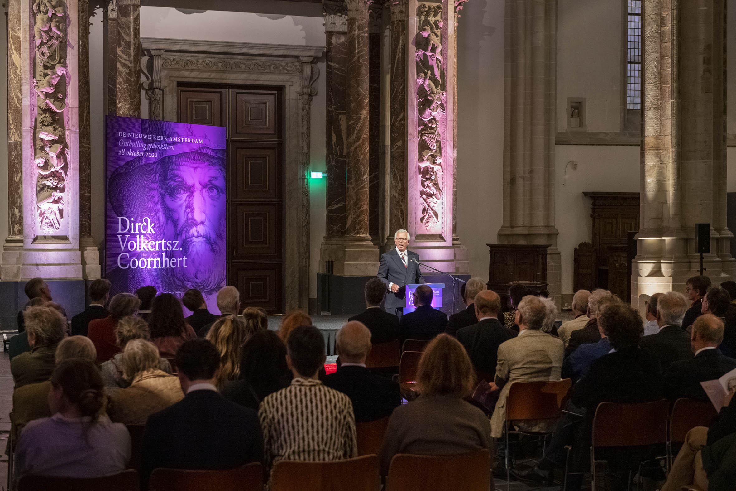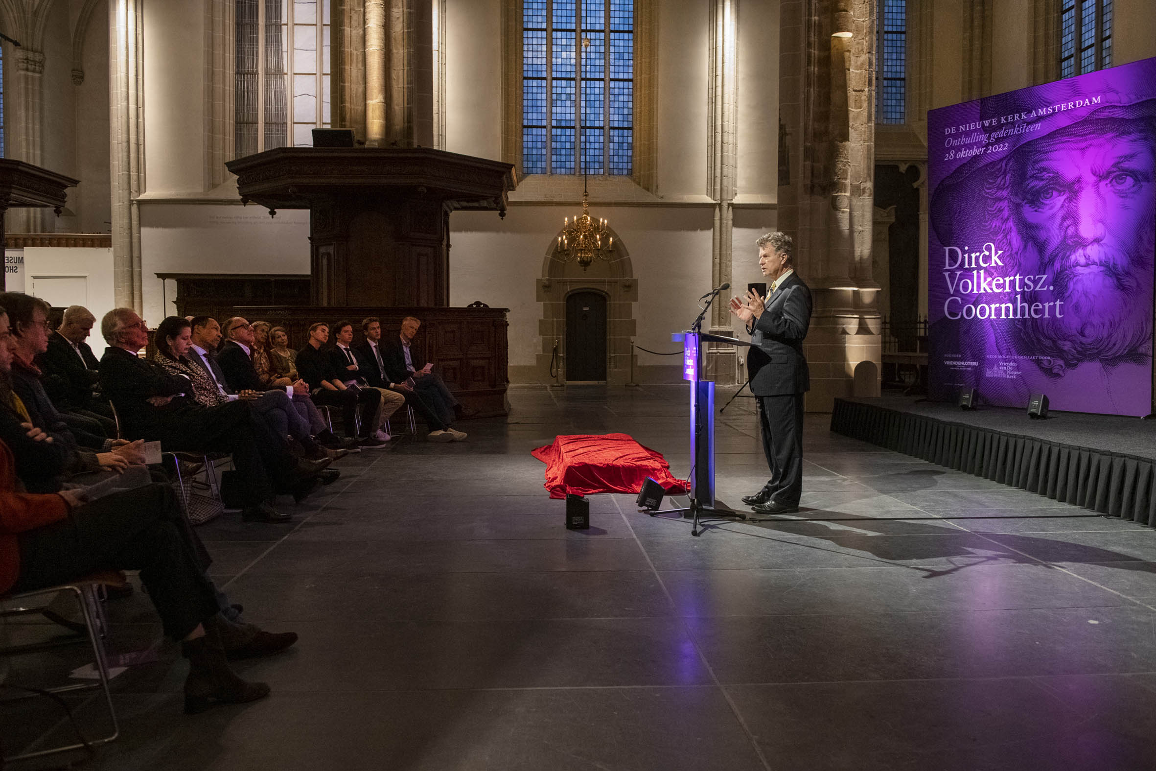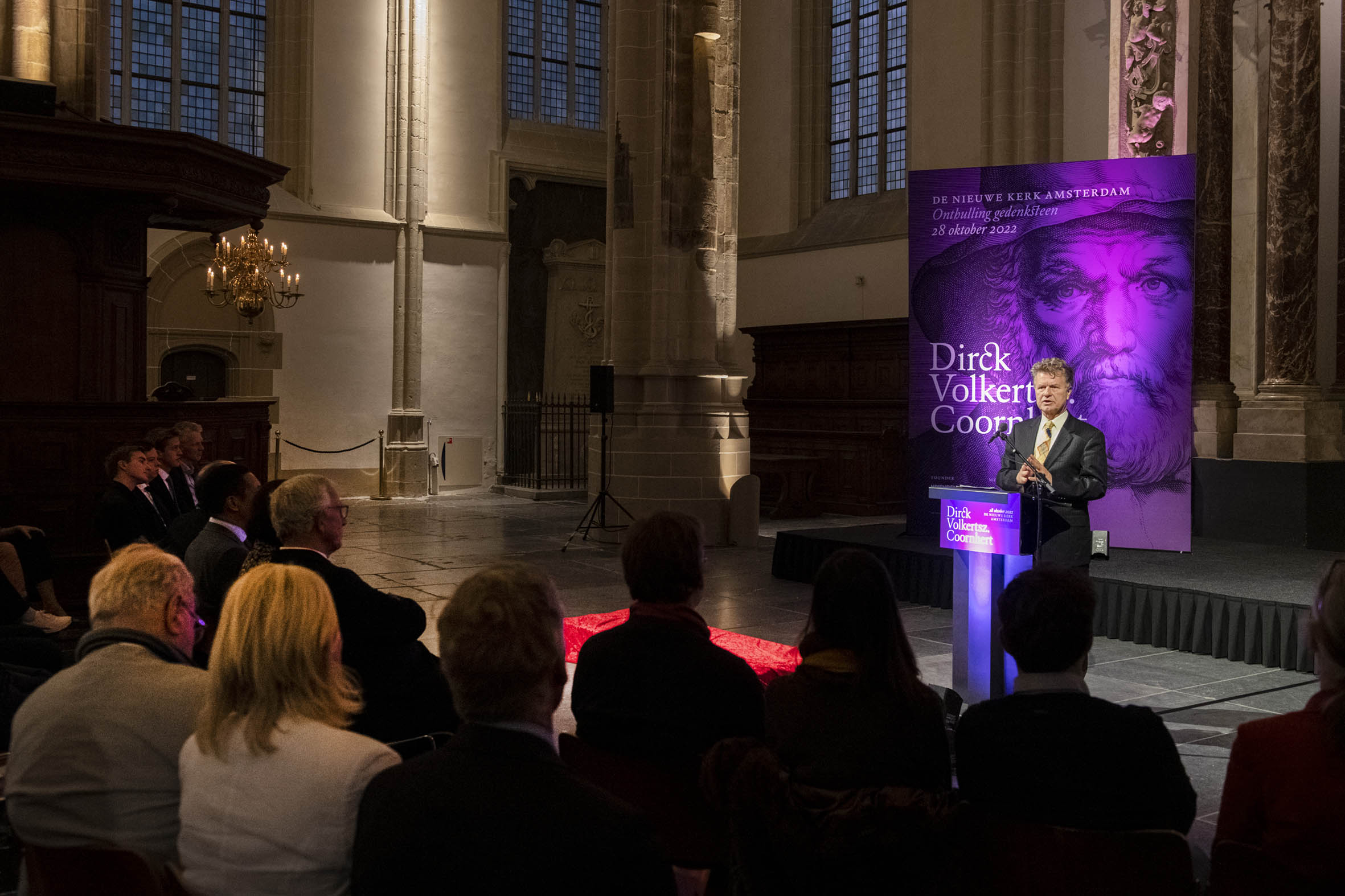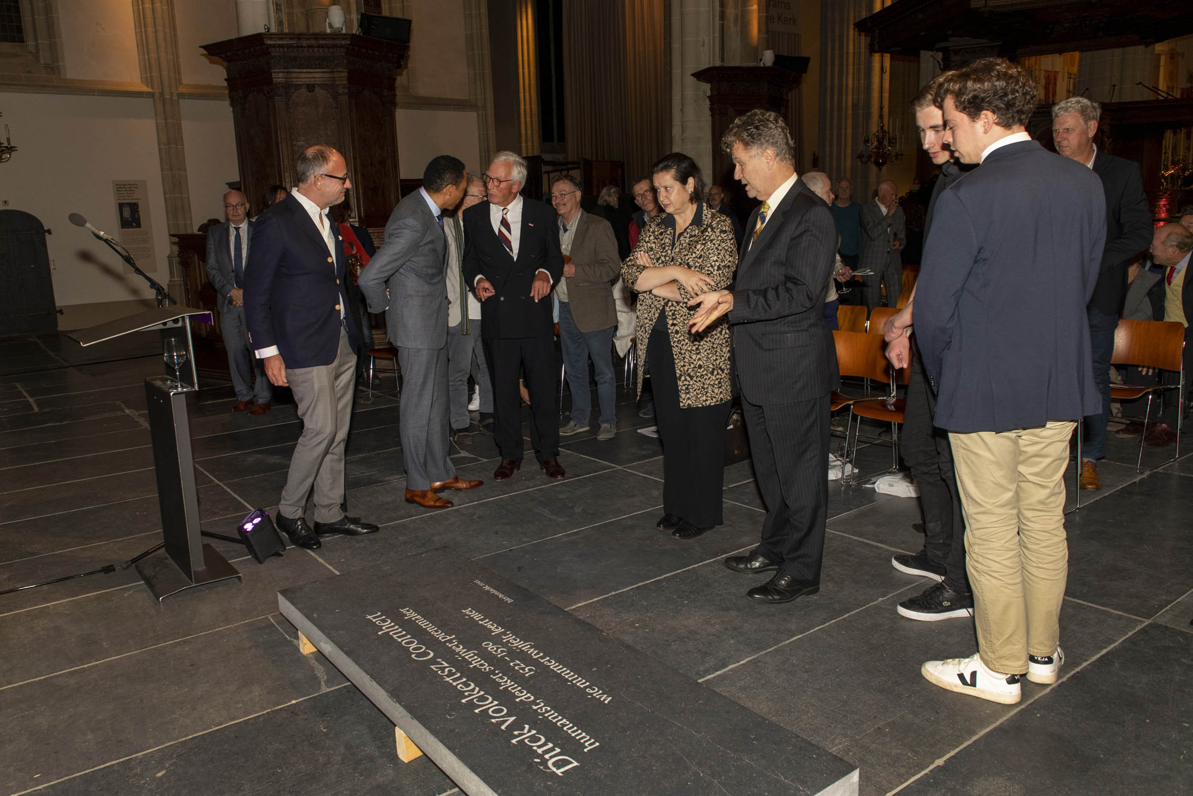 Tekenen van het gastenboek door Boris Dittrich (1), Wim Cerutti (2) en Franc Weerwind (3). Welkom door Annabelle Birnie, directeur Nieuwe Kerk (4-7). Inleiding door Paul Mosterd, adjunct-directeur Nieuwe Kerk (8-9). Voordracht door Wim Cerutti (10-13), Boris Dittrich (14-15) en Franc Weerwind (16-18). Onthulling van de Coornhert-gedenksteen door Dittrich, Cerutti en Weerwind met drie leerlingen van het Coornhert Lyceum (19-22). Drankje na afloop (23-32) met o.a. Willemijn Cerutti en Jan Dirkzager (27), Albert Patijn, Machteld en Willem Veenhoven, Joan Patijn (28). Martin Sommer, Wim Cerutti, Louise van Zetten, Jan Spoelder (29). Afscheid van Coornhert (32).
