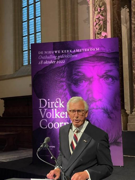 Eerste spreker was de voorzitter van de Coornhert Stichting Haarlem Wim Cerutti, die een samenvatting gaf van de belangrijkste denkbeelden van Coornhert om te komen tot een rechtvaardige samenleving: vrijheid, gelijkwaardigheid, tolerantie, kennis, waarheid en naasteliefde.